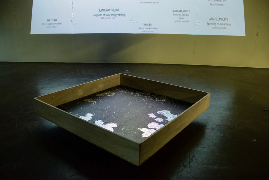 The information projected onto a large screen projection controls the rhythm and development of the installation. At the centre a thermal camera records live images of the visitors. Around the edges are an array of different number counters. Each counter displays statistics in realtime from a different event that is taking place either locally, globally or in outer space. Some relate to human activity whilst others are naturally occurring phenomenon. They show For example - the amount of air breathed by the artist so far that day, the kilometers of toilet paper bought so far that year around the world or the amount of time until the next visible comet.